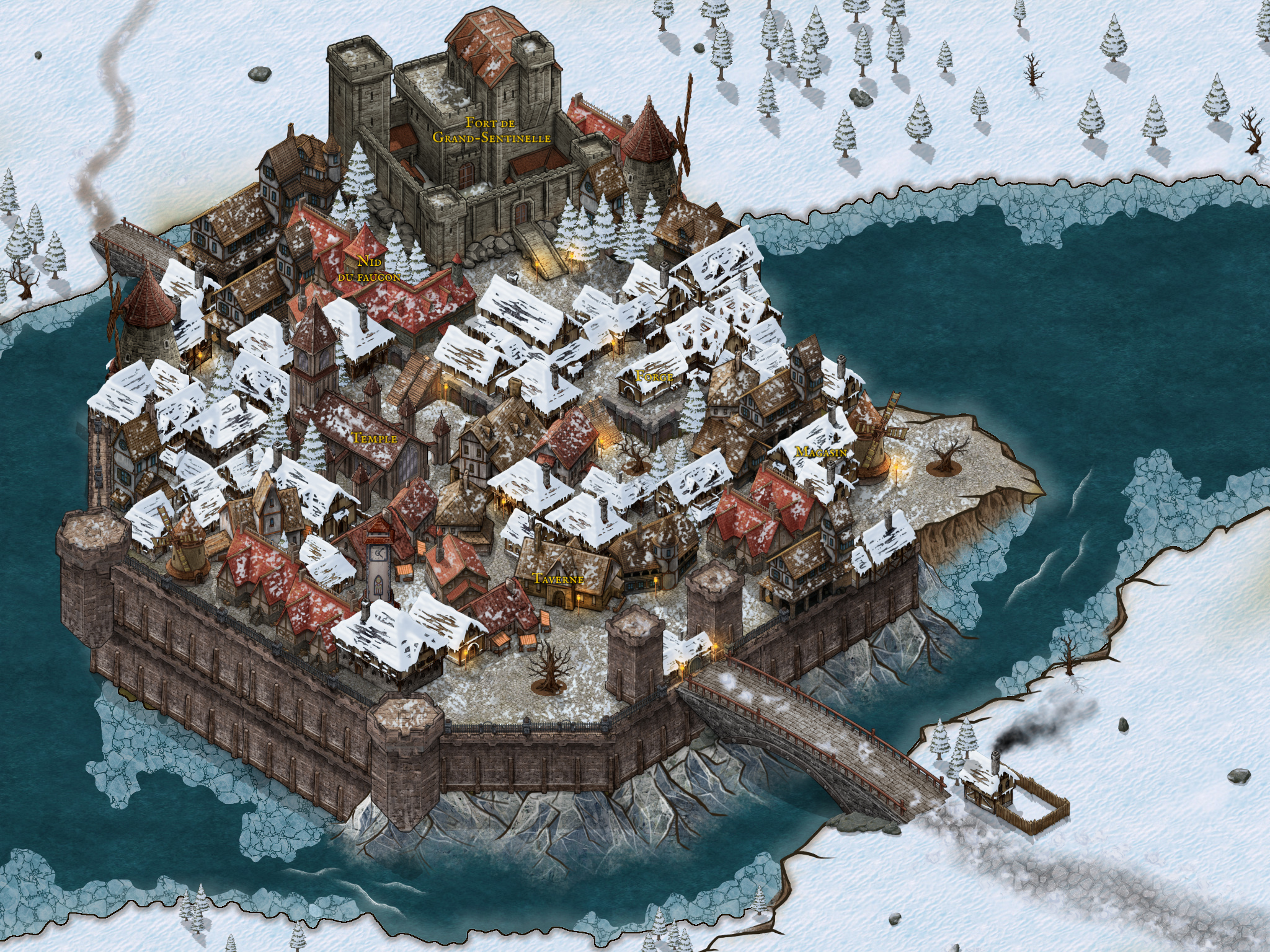 Sur un îlot rocheux on milieu de la rivière Froide, Bourg-Venteux se détache au loin, dernière cité du nord marquant la frontière des terres sauvages. A son sommet, le fort de Grand Sentinelle domine les plaines environnantes, et surplombe les rues escaprées du petit bourg aux toits pentus.