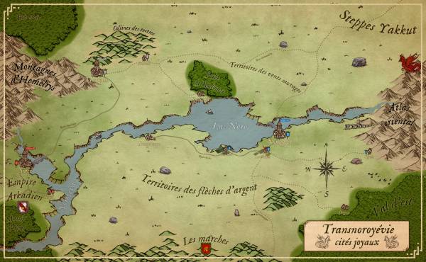 La transnoroyévie est un carrefour de passage important des routes caravanières venant de l'est qui terminent leur route dans les cités libres du nord, également nommées cités joyaux, îlots de civilisation au milieu de la nature féroce. C'est une terre d'aventuriers, de marchands audacieux et de mercenaires, où le dangers rôde au delà des dernières collines des rares villages fortifiés. Les hivers y sont rude, les été très chaud, et les infrastructures très distantes les une des autres. Attaques de brigands, de nomades ou de monstres y sont courantes, rares sont ceux qui y voyagent sans escorte.
