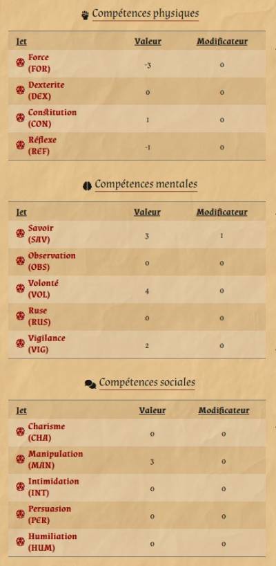 En plus de ses compétences, un personnage est définis par des compétences dérivées. Ces compétences sont calculées sur base des compétences primaires.