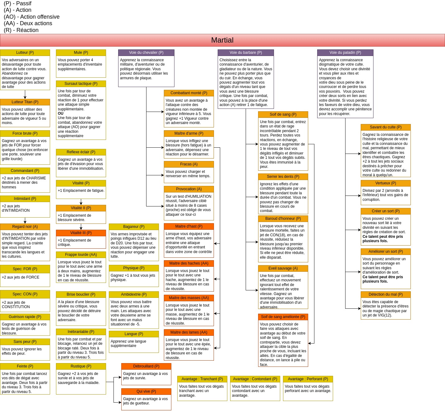 L'archétype Martial incarne la force, la discipline et le savoir-faire de ceux qui vivent et respirent pour l’art du combat. Chevaliers, soldats, gladiateurs ou guerriers itinérants, ces personnages excellent dans le maniement des armes, le port des armures et la résistance aux dangers physiques. Leurs compétences s’étendent de la stratégie militaire à l’endurance brute, et leur présence impose souvent le respect, voire la crainte. Ce sont ceux qui prennent les devants en première ligne, guidés par leur courage et un entraînement rigoureux qui leur permet de dominer le champ de bataille.