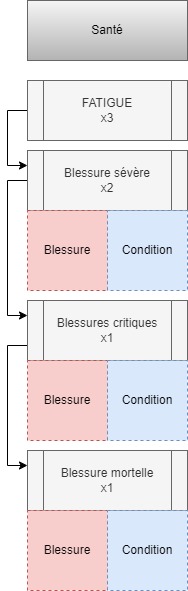 La santé d'un personnage est représentée par des emplacements de blessures. Lorsqu'il subit une attaque réussie, un de ces emplacements est rempli. Il existe 4 niveaux de blessures :