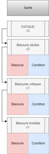 - ❖ Fatigue : Bien que ce ne soit pas une blessure à proprement parler, elle représente l'épuisement physique lié au combat. La fatigue n'a pas d'impact direct sur les capacités du personnage.