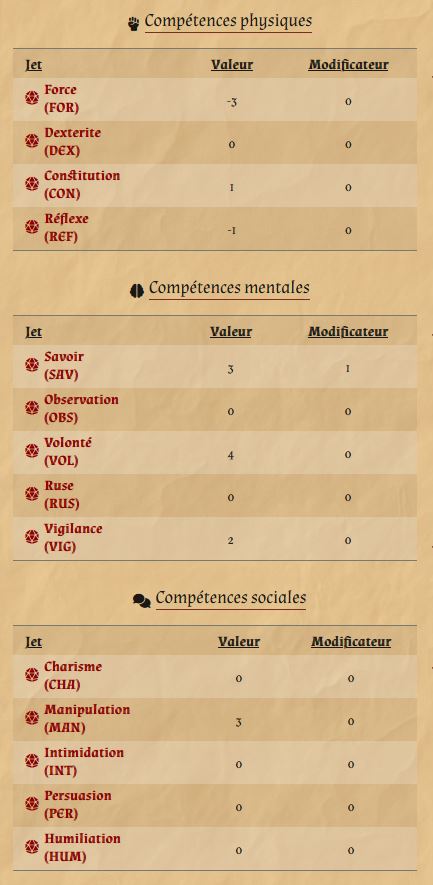 - ❖ Modificateur de talents : il dépend des talents qui ont été choisis par le joueur pour son personnage.